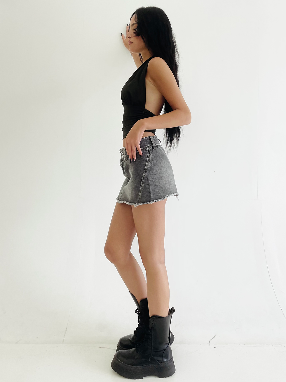 JEAN MINI POLLERA TIRO BAJO AZUL MATIZADO CON CINTURA ANCHA Y DOS BOTONES